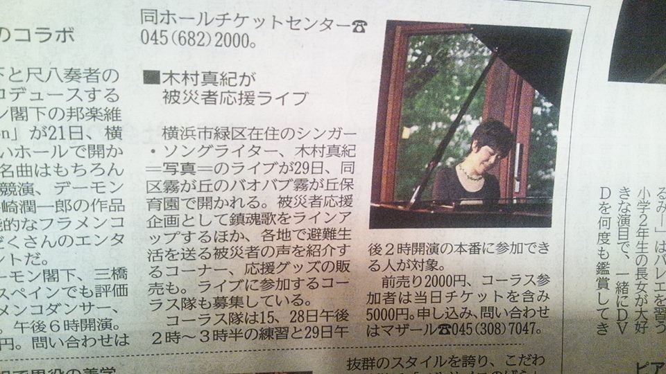 3月10日神奈川新聞朝刊<芸能面>に3月29日マザール主催木村真紀音楽ライブを紹介して頂きました。